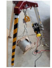 Tripod anchoring system with telescoping legs. The head has four connection points. Maximum working load: 500 kg. Breaking strength: 22 kN. Height is adjustable from 147 to 229 cm. Diameter: min 140 cm, max 213 cm. Packed size: 23 x 23 x 172 cm.